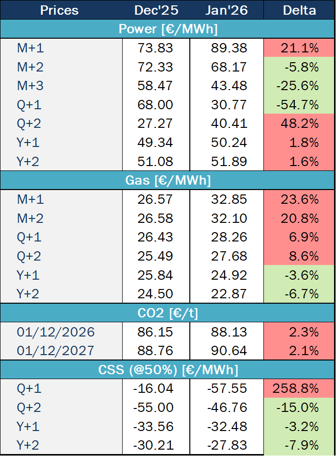 In contrast to the rebound observed in spot prices, Power Cal’27 contracts have shown only limited upside compared to the previous month in the UK, Germany and Italy, while remaining broadly stable in Spain and France. This reflects a medium-term outlook in which markets anticipate some normalization of fuel costs as extreme cold conditions ease, while Spain and France continue to benefit from strong renewable generation and robust nuclear availability heading into 2026.