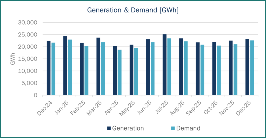 In December 2025, renewable energy sources accounted for 48.9% of total generation mix. This was lower than in November (when renewables covered 56.7% of the mix), but slightly higher compared with 48.0% in December 2024.