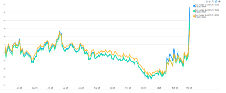 In just a few sessions, the forward curves spiked sharply higher, led by gas. From 27 Feb to 3 Mar, TTF jumped from ~€31–32/MWh to €~€43/MWh across Q2-26, i.e. roughly +11% (Q2), +8.6% (Q3) and +5.85% (Q4), marking a clear risk-premium peak on the back of supply/security headlines.